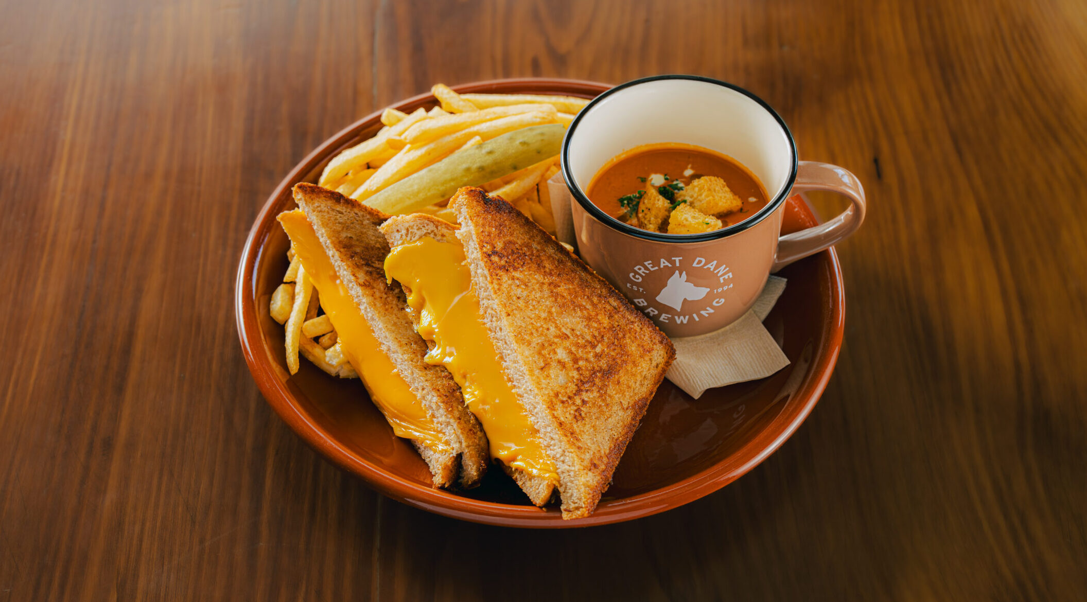 Grilled cheddar cheese sandwich on wheat with a cup of tomato soup